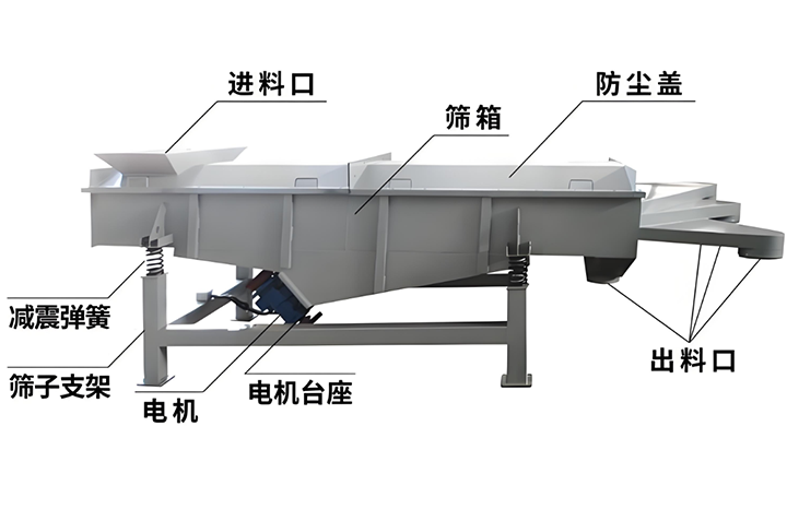 亮粉分級直線篩主要由篩箱、振動電機、篩網、減震裝置、進料口、出料口及機架組成。篩箱為傾斜矩形,內部分層裝 2-200 目篩網,實現多粒度分級;振動電機單側或對稱裝于篩箱兩側,通過定向激振力驅動篩箱直線往復運動,讓亮粉在篩面分散、透篩。減震裝置用彈簧組件連接篩箱與機架,緩沖振動、降噪音;進料口設導流板防亮粉堆積,各層篩網下有獨立出料口,排出不同粒度亮粉成品。
